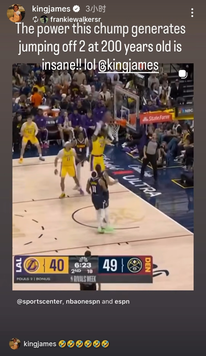 北京时间1月22日,詹姆斯在IG社媒上转发了朋友的动态。他的朋友晒出詹姆斯在对阵掘金比赛中的扣篮画面,并配文写道:“这老家伙都200岁了,还能双脚起跳爆发出这么恐怖的力量,太离谱了!”詹姆斯转发时也配上了6个笑哭了的表情。